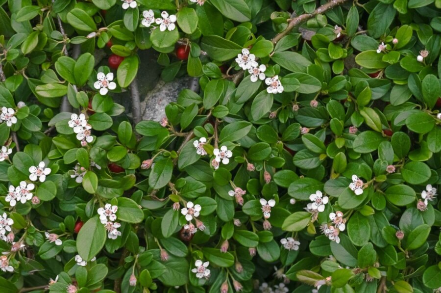 • Le cotonéaster de Dammer est également apprécié pour sa floraison en mai et juin, où ses fleurs blanches contrastent joliment avec son feuillage sombre.