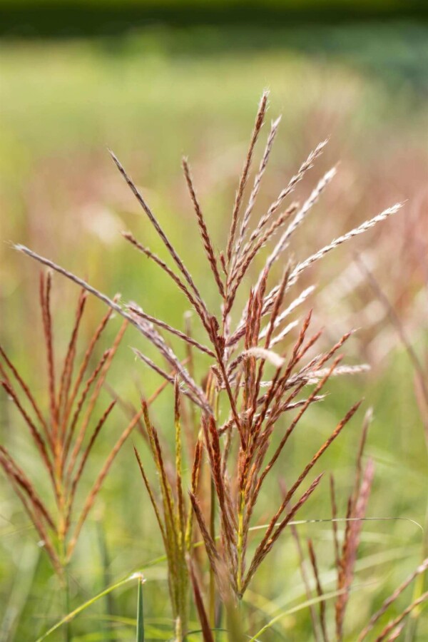 Herbe ornementale décorative avec des panicules de fleurs rouges à bronze ; apporte hauteur, mouvement et structure, également attrayante en hiver.