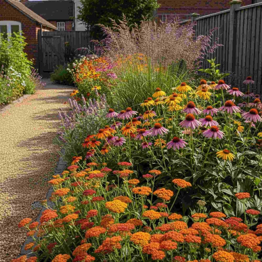 • Mélange équilibré de vivaces fleuries et de graminées ornementales pour la structure
